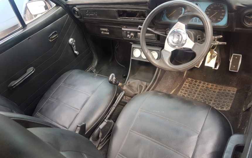 INTERIOR - SEATS AND DOOR CARDS HAVE BEEN RECOVERED. NO RIPS OR TEARS BUT AGAIN A BIT CHEAP LOOKING. AFTERMARKET STEERING WHEEL. GOOD BLACK HEADLINING.